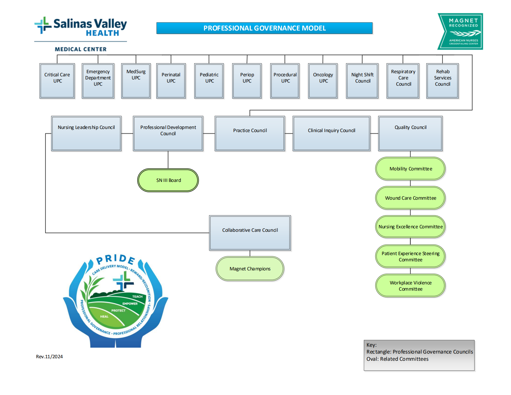 Professional governance at Salinas Valley Health Medical Center is a leadership and decision-making model that empowers clinical nurses’ ownership of clinical practice and the professional practice environment. It ensures that clinical nurses and other professionals have the authority to make decisions related to the care they provide, and the resources needed to evaluate outcomes, lead improvement initiatives, and continually evaluate practice to ensure alignment with the most current evidence and professional standards.