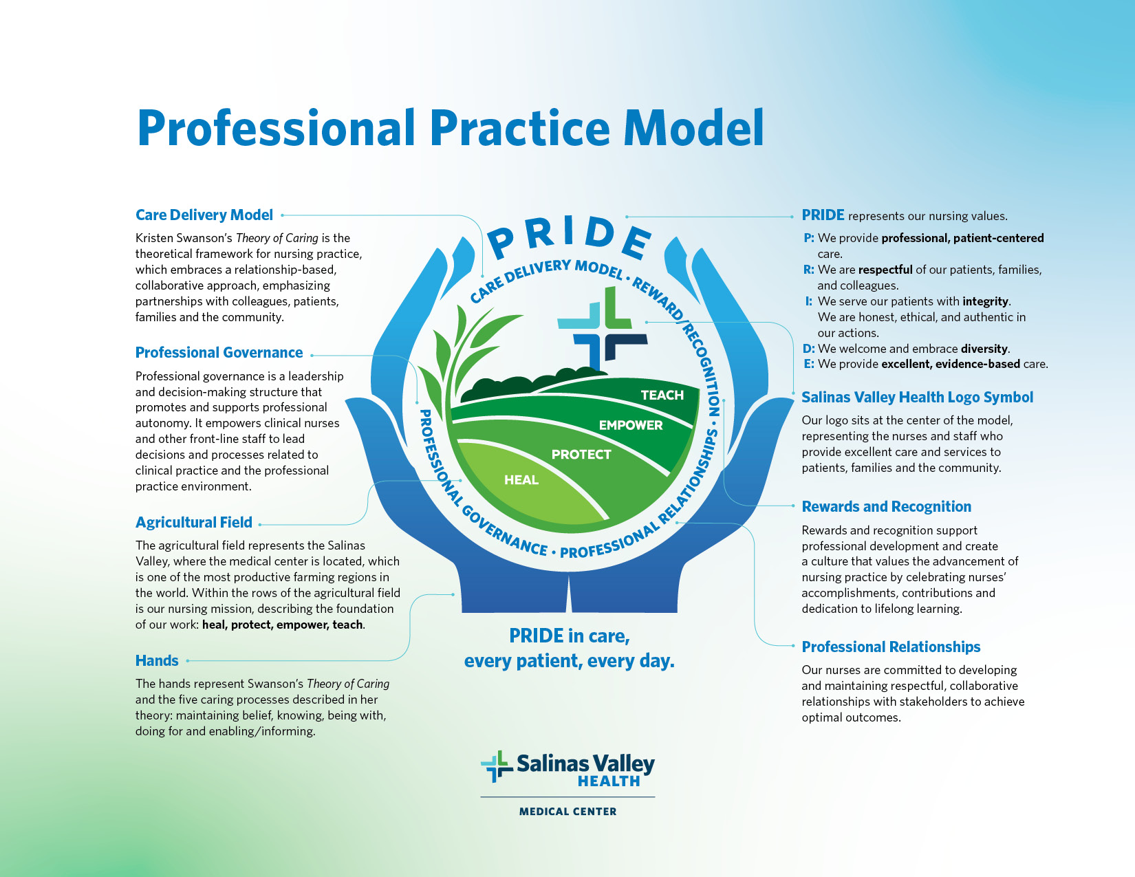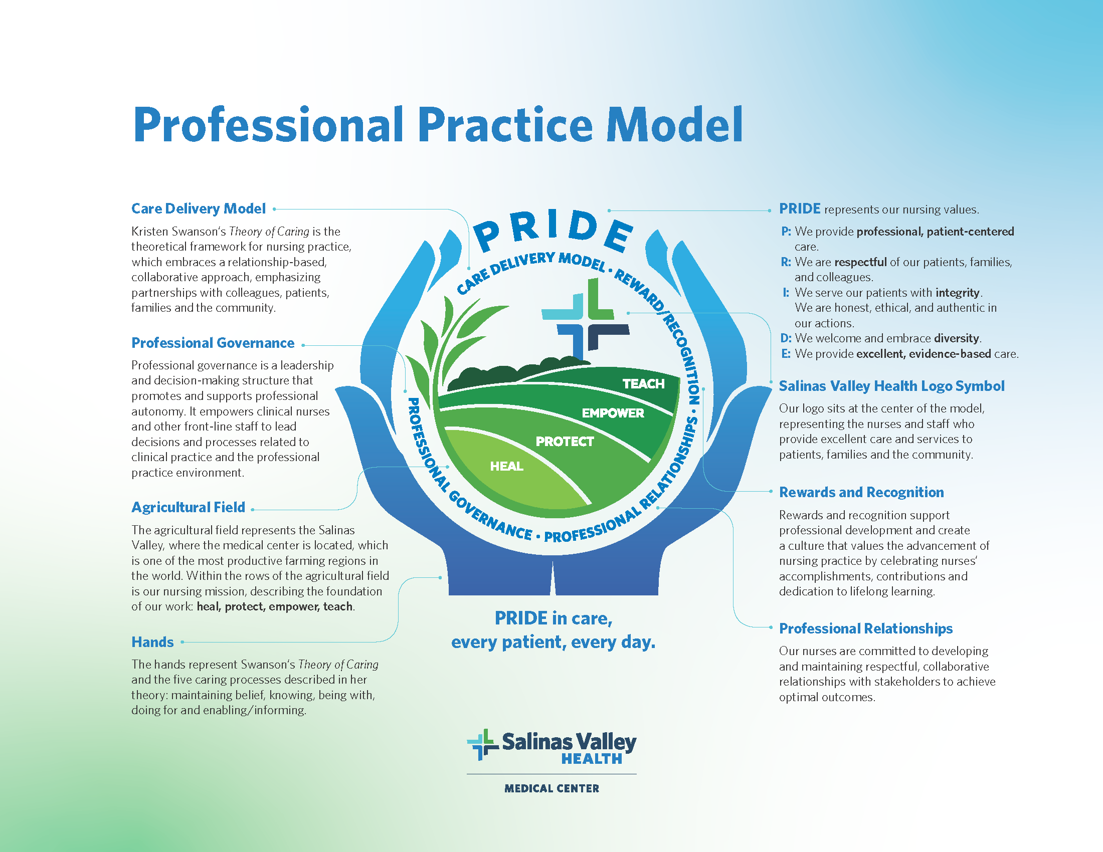 Professional nursing practice at Salinas Valley Health Medical Center is guided by the PPM. The model’s components depict and guide nursing excellence throughout the organization in alignment with our nursing mission, vision, and values.