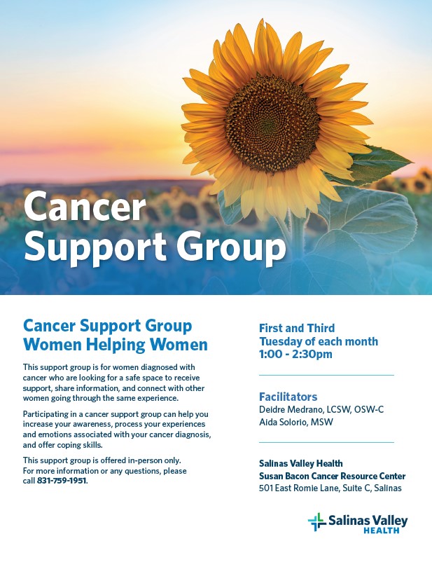 Event Details Cancer Support Group - Women Helping Women Categories: Support Groups About This Event Details: Registration Price: Free Registration Instructions: For more information or any questions, please call 831-759-1951