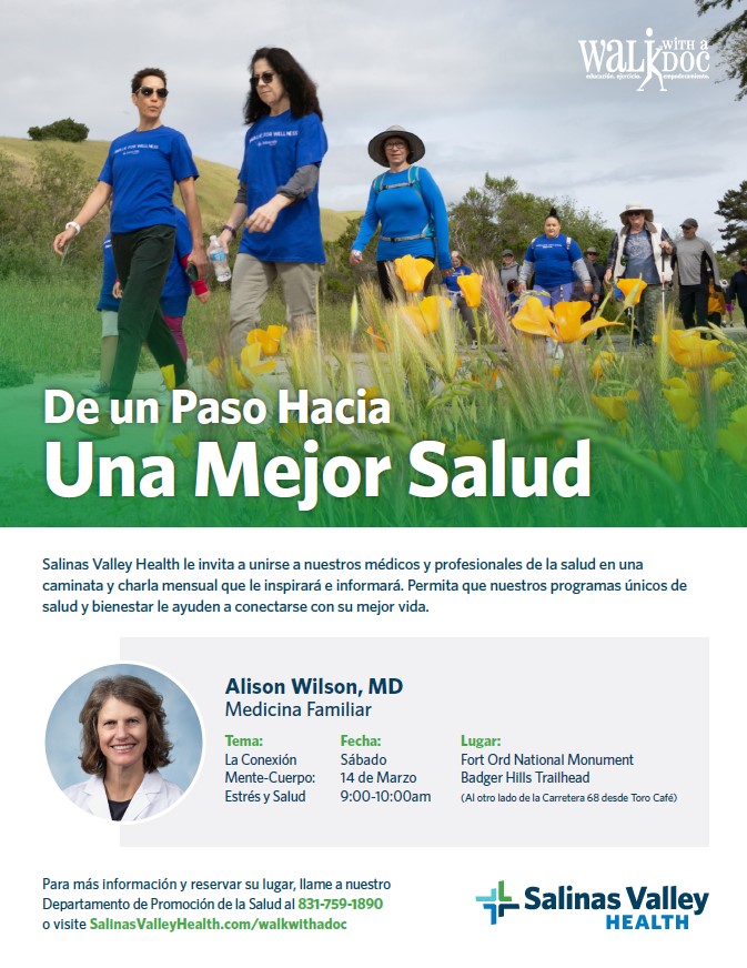 Salinas Valley Health invites the community to Walk With A Doc. This event encourages healthy physical activity in people of all ages. Board certified physicians will make presentations on specific health topics prior to the one hour walk and answer people’s questions during and after the walk.