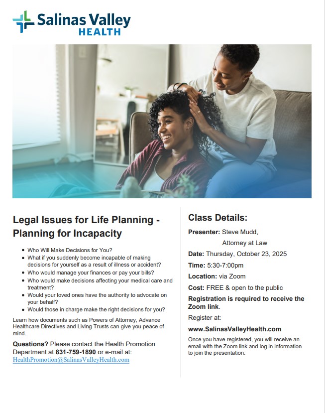 Event Details Legal Issues for Life Planning: "Planning for Incapacity" Categories: Community Events, Classes About This Event Details: Registration Price: Free