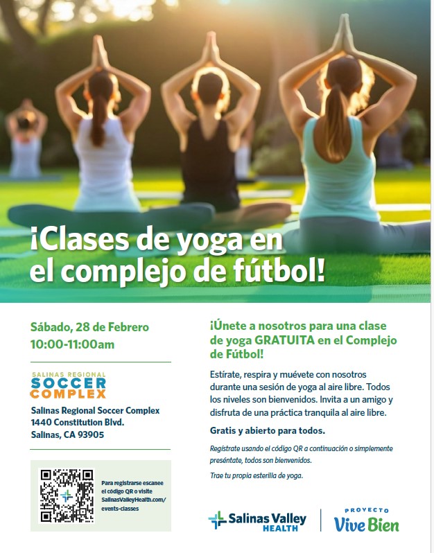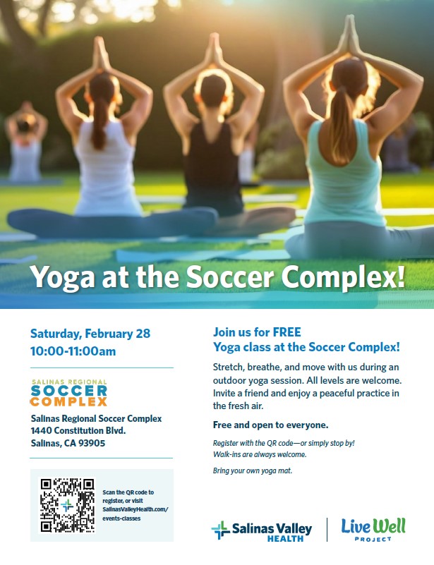 Event Details Yoga at the Salinas Soccer Complex About This Event Details: Registration Price: Free Registration Instructions: To register, please use the link below:https://svmh.wufoo.com/forms/yoga-at-the-soccer-complex/