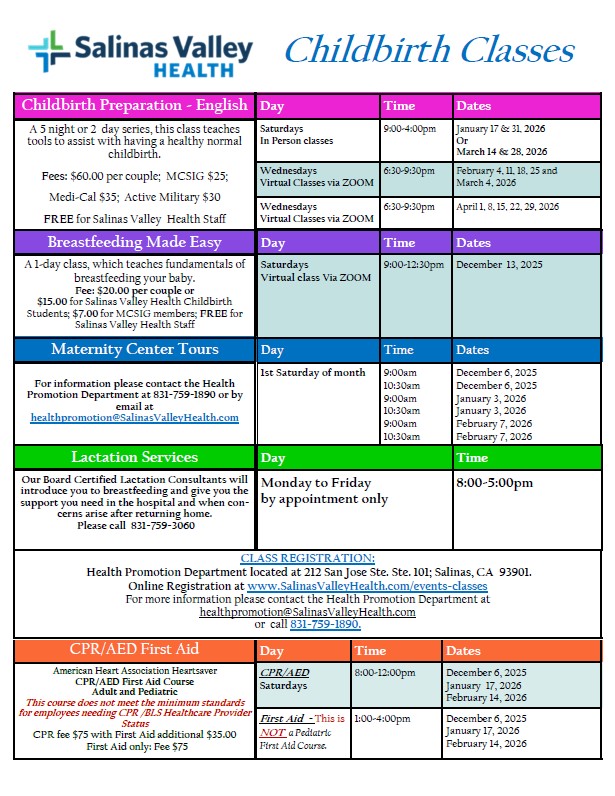 Fees: $60 per couple; $35 with Medi-Cal; $30 active military; $25 if MCSIG member; FREE for Salinas Valley Health Staff.