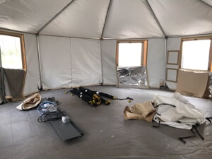 The larger tent being decommissioned for cleaning is the one that is three separate isolation units joined by two tent hallways, all equipped with negative airflow. A smaller tent to the left of the Hospital’s ER entrance will continue to serve as a COVID-19 screening area.