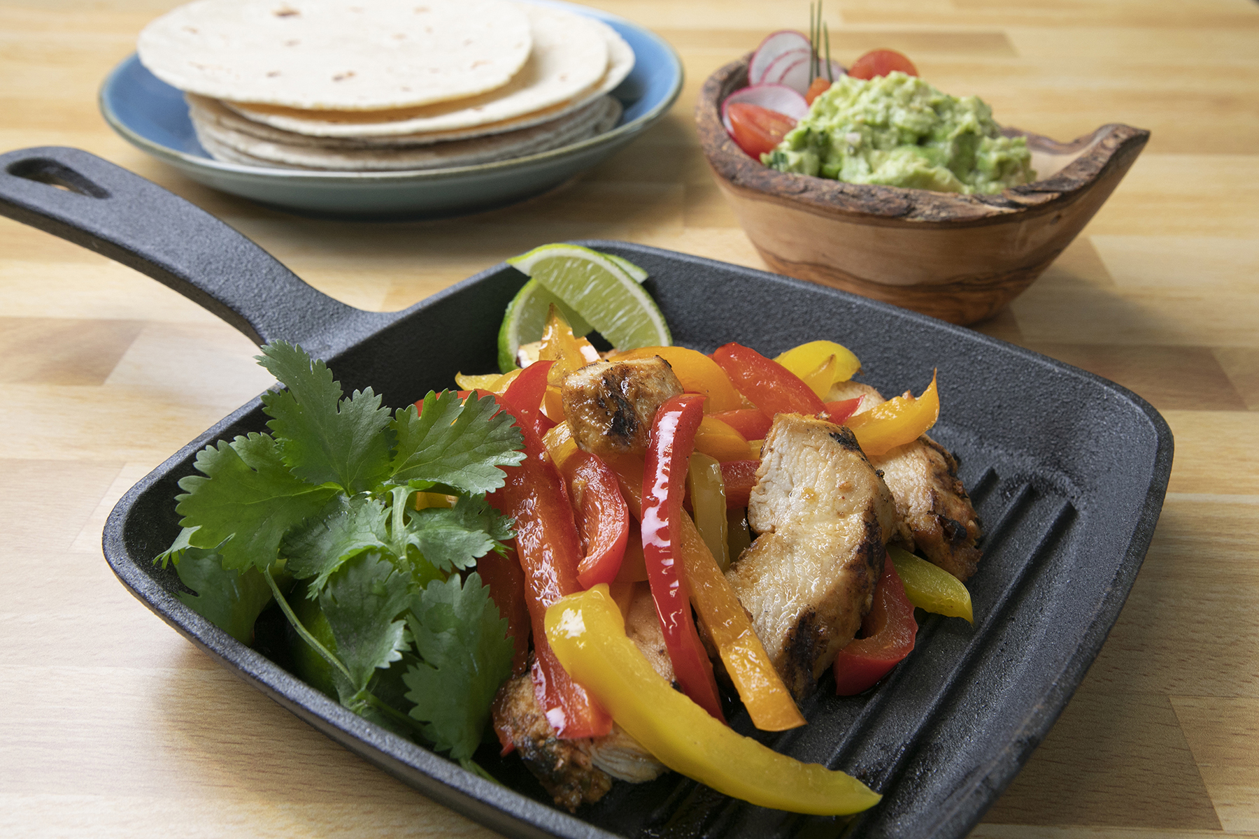Marinate the chicken for 2-3 hours in a Ziploc bag, then grill the chicken breast, cooking to an internal temperature of 165°F. Let the chicken rest and cool slightly, about 20 minutes. Slice the chicken into strips. In a large skillet, heat 2 Tbsp. olive oil. Add the onions and cook until the edges are beginning to turn golden brown. Add the bell peppers and continue to cook for another 3-4 minutes. Add the cut chicken and toss to combine. To serve present family style along with the tortillas, sliced limes and guacamole.