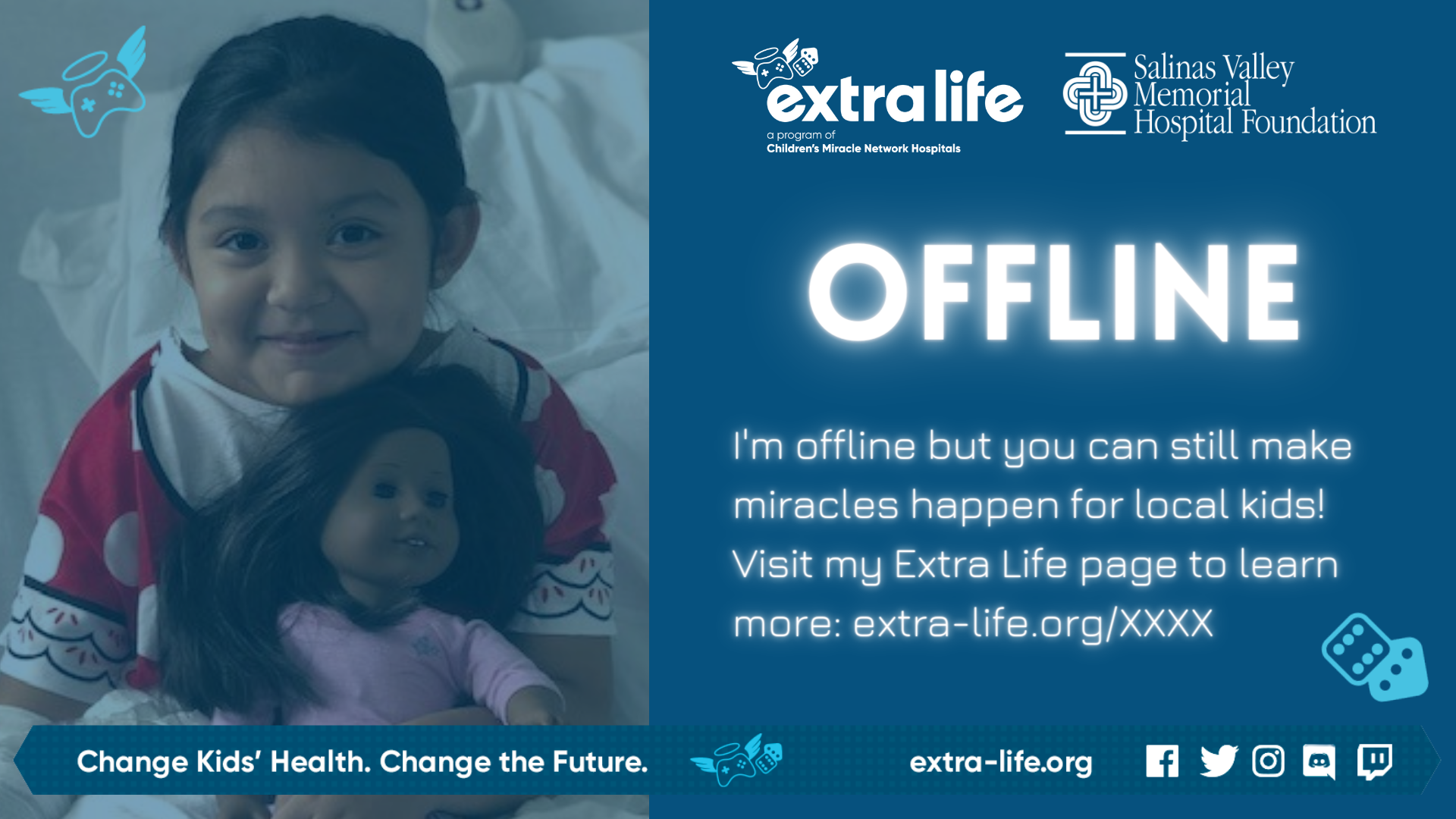 Twitch Offline Screen (1020 x 1080px) - Add your custom Extra Life page link and you can make miracles happen even when you're offline!