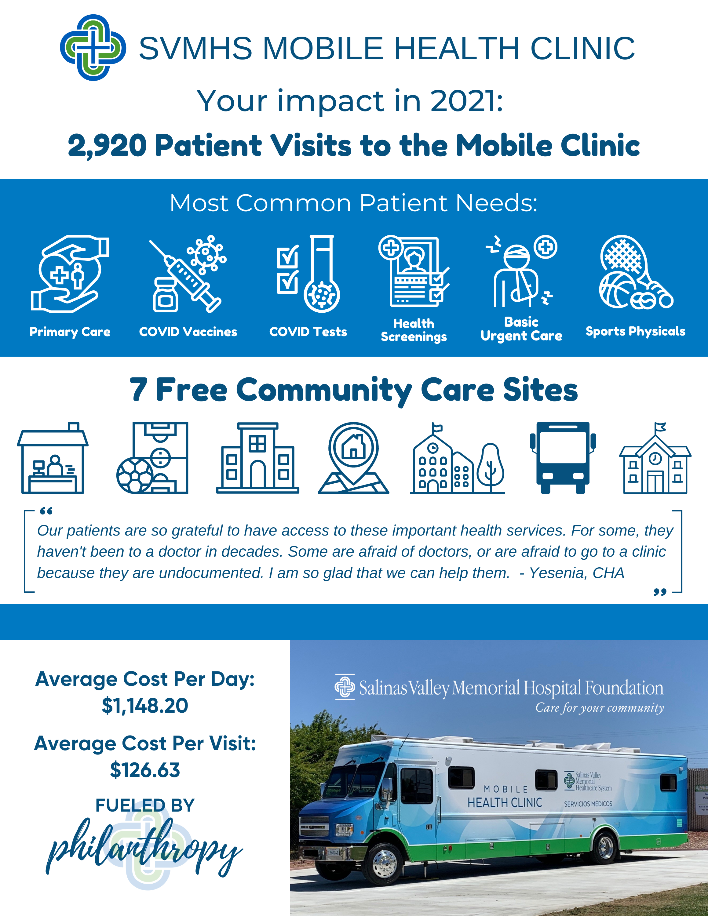 Launched in 2020, the Salinas Valley Health Medical Center Salinas Valley Health Mobile Clinic is bringing FREE quality healthcare to underserved areas of our community. In 2021, nearly 3000 patients were served across 7 care sites. This incredible resource is 'Fueled by Philanthropy' and is on the road thanks to donors like you who believe in healthcare access for all.