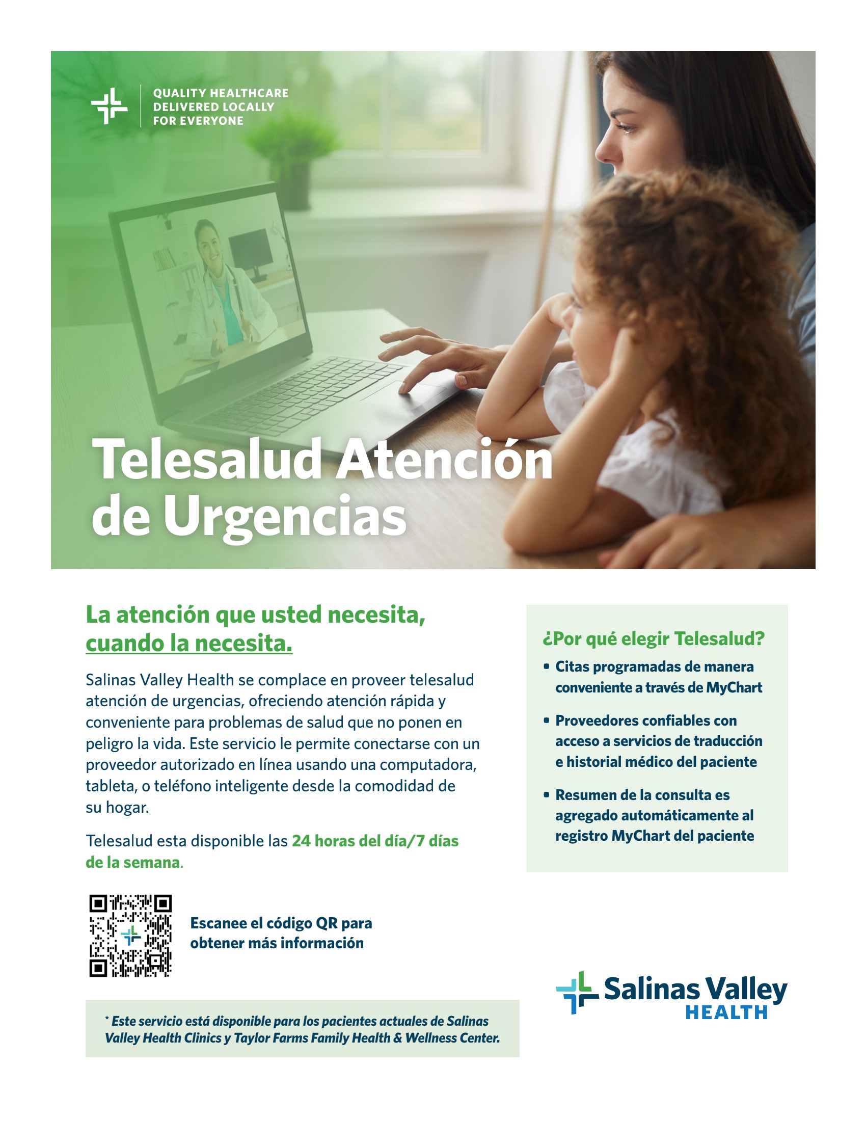Telesalud es para pacientes de Salinas Valley Health Clinics y Taylor Farms Family Health & Wellness Center que necesitan atención rápida y asequible para problemas de salud que no sean de emergencia fuera del horario de oficina habitual. Ya sea que usted esté en casa o viajando, telesalud le brinda fácil acceso a la atención que necesita.